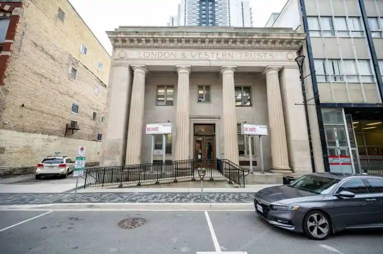 Prime opportunity to launch your business in a piece of Londons history! This beautifully restored circa-1920 heritage bank building offers 6,182 SF above grade. Ideally situated in the heart of downtown London just steps from Budweiser Gardens and Covent Garden Market, the property enjoys exceptional pedestrian and event traffic. Interior highlights include elegant plaster vaulted ceilings, all-new LED lighting throughout the main and upper levels, and a 14 ft x 14 ft open mezzanine landing that overlooks the grand main area. The layout features a fully refurbished 50′ x 12′ kitchen at the rear, two spacious front offices, two main floor washrooms, and three large offices on the upper floor, including a grand presidential office. The building also includes three operational vaults and dual entrances from both King and Richmond Streets. Private rear parking for up to eight vehicles is included. Zoned DA1, the property allows for a wide range of uses including assembly halls, art galleries, commercial recreation, financial institutions, museums, studios, restaurants, and more. Offered at $13/SF net plus $6/SF additional rent, totalling $9,788/month plus HST and utilities. An additional 4,300 SF lower level is also available for lease if desired, with rates to be negotiated.