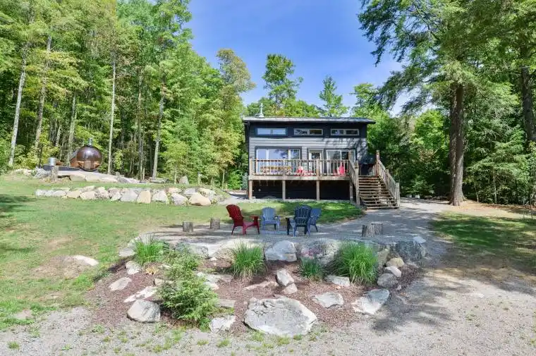 Discover this quiet cottage on Boyne Lake, a Haliburton treasure. Infused with charm, this retreat sleeps 6, perfect for family and friends. The open-concept layout invites relaxation, a functional kitchen space with SS appliances highlighted with a cozy Lopi fireplace and mesmerizing lake views. A unique loft bedroom and a clever Murphy bed offer comfort and space-saving ease. Boasting 300′ of lake frontage and almost 4 acres of tiered, treed land, this haven ensures privacy and room to expand. A new 4-bedroom septic system and drilled well support future growth here. Savor gatherings on the spacious deck with a picnic table and the BBQ hooked up to the main propane tank, or unwind by the lakeside fire-pit with family and friends. Ample parking here with a circular driveway that also includes an area for a potential camper/trailer to enjoy stunning lake views and a dock ideal for awesome bass fishing. Indulge in a wellness retreat with the bubble window sauna, cold plunge tank, and an outdoor shower, all with lake-focused views, creating your personal escape. Powered by robust solar panels, tankless HWT and an automatic on-demand Kohler propane generator plumbed to the main tank for seamless reliability, this fully furnished cottage is ready for instant enjoyment. Just 10 minutes from Haliburtons shops, restaurants, and hospital, yet a tranquil escape. This Boyne Lake gem blends rustic allure with modern comforts. Call today to view this off-grid paradise!
