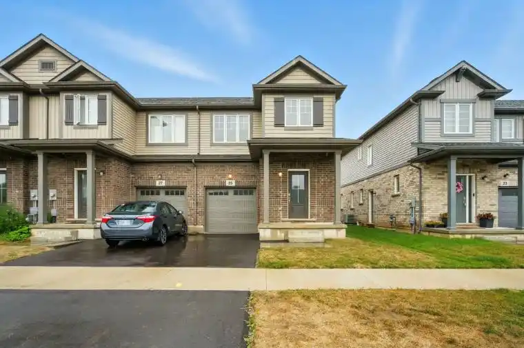 Welcome to 25 Saffron Way, a newly built 2-storey Mountainview Homes residence in the heart of Pelham. This move-in ready 3-bedroom, 3-bathroom home offers 1,388 sq ft of thoughtfully designed living space in a family-friendly neighbourhood. Inside, you will find a bright and airy layout with 9-foot ceilings, large windows, and a modern open-concept main floor perfect for entertaining. The stylish kitchen features stainless steel appliances, warm cabinetry, and sleek tile flooring. Upstairs, enjoy spacious bedrooms, including a primary suite with a walk-in closet and ensuite, plus the convenience of second-floor laundry. Additional highlights include a single car garage, electric car charger rough-in, 200amp panel, security system, on-demand hot water, A/C, HRV, and all appliances included. Potential for in-law suite with separate side entry and basement bathroom rough-in. The deep, fenced backyard is ideal for outdoor enjoyment or future landscaping. Set on a 21 ft by 108 ft lot, this home offers comfort and convenience, just minutes from Meridian Community Centre, Grocerie, local shops, and highway access. Built in 2024, this is an exceptional opportunity to own a stylish, low-maintenance home in a highly sought-after area of Pelham.
