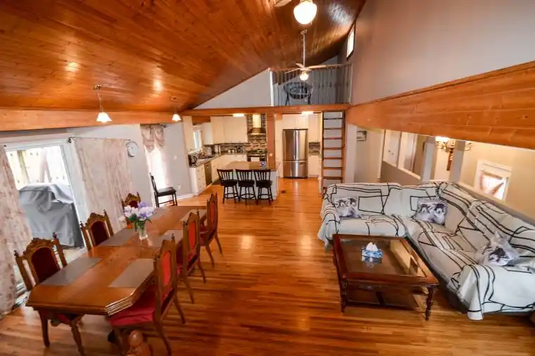 Steps to Georgian Bay, the Trans Canada Trail access & a waterfront park. Move in ready, 3 Beds on ground level, 1.5 bath, open concept main floor, beautiful cathedral ceiling, updated kitchen w/quartz counters/island & custom cabinetry, living rm, dining area, work area and small loft, step up to a 16x30ft. family room w/gas fireplace. There is an oversized heated double garage, walkout deck, 24 ft. above ground pool. April 2022 new Furnace, A/C & Fireplace, natural gas BBQ hookup at patio doors.