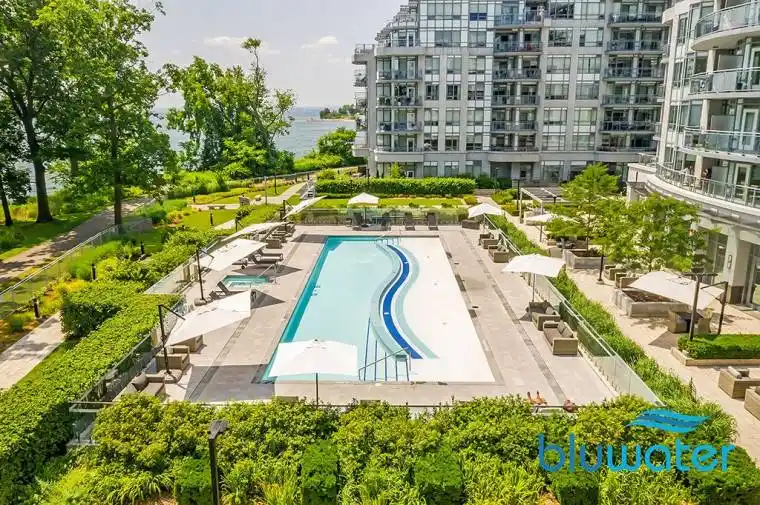 Welcome to ultra-luxurious resort style living in one of Oakville’s most beautiful condos sitting on the shore of Lake Ontario! This beautiful and spacious unit has been freshly painted throughout. The unit provides 9 ft. ceilings, gorgeous luxury vinyl plank flooring, a sleek white gourmet kitchen with high end European appliances (AEG and Liebherr), granite countertops and backsplash with breakfast bar. Open concept dining and living area with a walk out to a private balcony with gas hookup for BBQs. A Master bedroom with floor to ceiling glass doors opens to a private balcony. There is a beautiful 4 pc.bath with extra deep soaker tub and shower. 1 parking spot (and the POSSIBILITY TO PURCHASE A SECOND ONE) and a locker. Bluwater Condominiums offer exceptional amenities including a gorgeous swimming pool, BBQs and dining area, outdoor fireplace and sitting area, Outdoor hot-tub, gym, yoga room, steam showers, sauna, hot tub, party room with kitchen and bar, library, guest’s suite and plenty of guest’s parking, 24 hour concierge and security. Easy access to walking/bike trails by the forest and the lake. Minutes to Bronte Harbour and downtown.