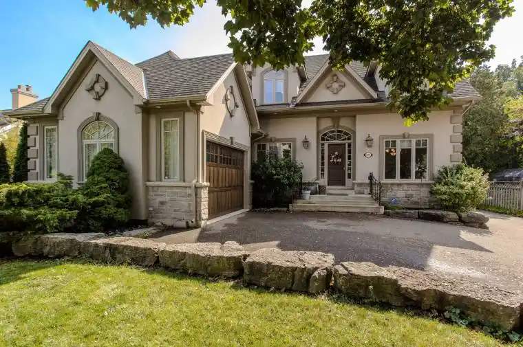 Welcome to 694 Cedar Ave, a rare half-acre oasis in Burlingtons coveted Aldershot neighbourhood, just five minutes from downtown and the lake. Custom built in 2009 with over 4,500 sq ft of finished living space (3,300 above grade) and soaring 9 ceilings, this residence combines timeless craftsmanship with modern updates. The park-like grounds feel more like a country retreat than a city lot. A shimmering saltwater pool with safety cover, tiered deck with custom louvered pergola, covered porch with pot lighting, fire pit, and curated landscaping with maples, poplars, redbuds, and evergreens create a setting that is truly exceptional. Inside, the custom Gravelle kitchen with butlers pantry, walk-in pantry, and wine fridge flows into a sun-filled great room with expansive windows overlooking the gardens and pool. Hardwood floors, an elegant dining room, and a versatile main-floor den complement the space, along with a stylish powder room with heated floor. Upstairs, the primary suite offers dual walk-in closets and a brand-new spa-inspired ensuite with freestanding tub, tiled glass shower, towel warmer, double vanity, and heated floor. Three additional bedrooms include one with its own ensuite, while the main bath also features heated floors. The finished lower level extends the living space with 8 ceilings, oversized windows, a cozy gas fireplace, recreation room, guest suite, full bath, and generous storage. Parking is abundant with a paved driveway for up to nine cars, plus both an attached garage and a detached tandem two-car garage with front and back auto doors. This is a rare opportunity: space, privacy, and natural beauty, all in an unbeatable location.