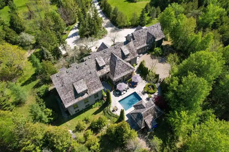 Discover Darby Lane, an extraordinary 39-acre country estate where privacy, timeless architecture, and refined living converge just 5 minutes from Thornbury. With effortless access to top golf courses, private ski clubs, Georgian Bay, and the areas finest shops and restaurants, the location strikes a rare balance between convenience and seclusion. Set back behind 600 feet of frontage, this English Country estate was designed by renowned architect Jack Arnold and custom built in 2005 by its current owners. Spanning over 6,000 sq ft, it offers 5 bedrooms, 6 bathrooms, and unmatched craftsmanship at every turn. At its heart, a vaulted great room with reclaimed wood-clad ceilings and a custom Rumford fireplace invites both grand entertaining and quiet evenings. Overlooking it, a chef’s kitchen boasts Viking and Bosch appliances, John Boos butcher blocks, a 12.5-ft cherry marble island with carved legs, hand-shaped limestone floors, and a walk-in pantry. The adjoining sunken dining room, seating 18, flows to a private courtyard for memorable gatherings. Architectural highlights include a brick masonry wall, Moet & Chandon riddling racks, and oversized single-hung windows framing serene vistas. The main floor primary retreat, complete with two-way Town and Country gas fireplace, sitting room, spa-like ensuite, and generous walk-in closet, offers a true sanctuary. A granite-tiled mudroom and limestone-clad powder room with copper sink complete the level. Upstairs, a loft doubles as library or office, while above the garage, a private in-law/nanny suite with separate entrance, gas fireplace, walk-in closet, and 3-pc bath ensures flexibility. The lower level features 9-ft ceilings, recreation room, gym, bar, bedroom, and bath. Outside, a 12×20 heated saltwater pool, lush gardens, and pool house form a resort-like oasis. Hidden west of the home, a 3,000 sq ft heated steel-clad building provides endless opportunity for storage, horse barn, or even a pickleball court.