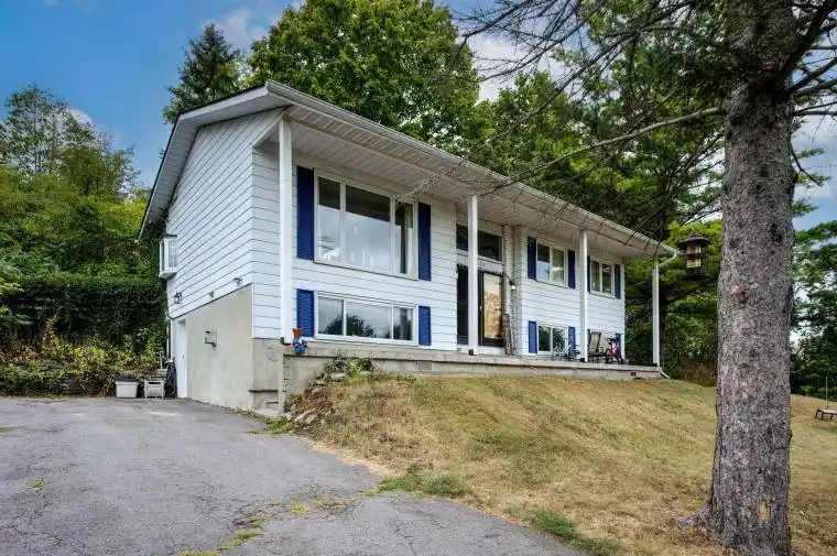 Nestled just minutes from town, this charming home sits on an extra-wide, treed lot offering both privacy and serenity with no rear neighbours. The property spans nearly an acre of wooded land, providing the perfect balance of natural beauty and convenience. Step inside to find gleaming hardwood floors and a bright, open-concept layout that seamlessly connects the kitchen, dining, and living areas, ideal for everyday living and entertaining. The dining room features a charming garden window, filling the space with natural light, while a garden door opens onto a spacious deck overlooking the tranquil backyard. The home offers two generous bedrooms on the main level (originally three, easily converted back if desired) along with a kitchen and mostly newer windows throughout. Downstairs, the cozy rec room is anchored by a gas fireplace, creating a warm and inviting atmosphere, and an additional large bedroom with its own gas fireplace provides versatility for guests, family, or a private retreat. Outside, the expansive lot is dotted with mature trees, offering both shade and privacy, and includes a detached garage for additional storage or workshop space. This property combines the best of country living with the convenience of being close to town, an ideal retreat to call home.