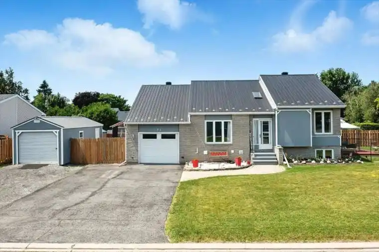 Welcome to this move-in ready carpet-free detached home on an oversized corner lot in the heart of the welcoming town of Embrun. You’ll be impressed by the curb appeal as you arrive on the large driveway that fits 6+ vehicles with an attached garage and a detached garage, offering a first glimpse of this tastefully updated property. The bright foyer features a generous closet and opens into the airy, open-concept layout with a sun-filled living room and striking vaulted ceilings. Just a few steps up, you’ll find a dedicated dining area adjacent to the stylish kitchen, complete with ample cabinetry, dual-tone finishes, stainless steel appliances, and a breakfast bar for casual seating. Step out from the dining room to the deck, where a private hot tub area and fenced side yard await. The main floor also hosts a well-sized primary bedroom, a spacious second bedroom, and a beautifully renovated 4-piece bathroom featuring a soaker tub and separate glass shower. The fully finished basement adds a spacious recreation room, third bedroom, and another full bathroom with laundry. Outside, enjoy the landscaped yard, the detached garage and northwest-facing deck, great for relaxing or summer barbecues. Conveniently located near schools, parks, recreation, and public transit, this home sits in a family-friendly community that blends rural charm with modern amenities and easy access to Ottawa. Come see it for yourself – you wont be disappointed.