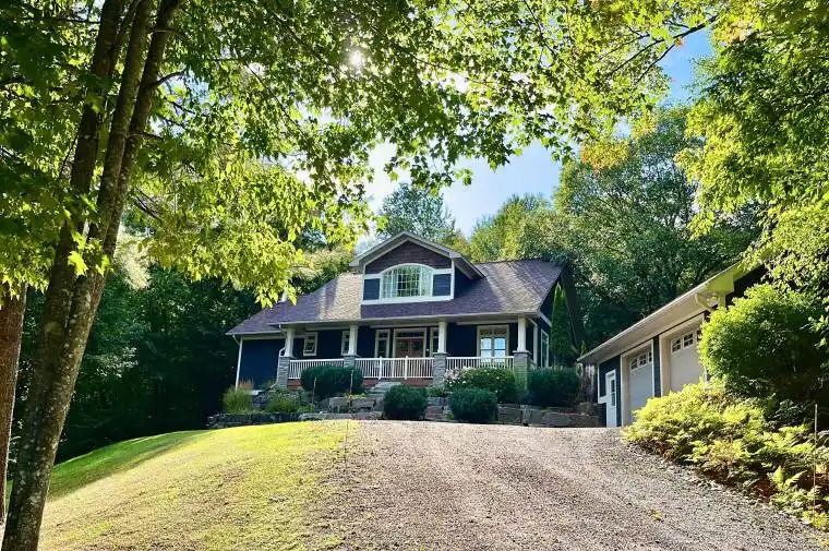 Escape to the Country! To a blissful haven in the woods. Ensconce yourselves in the wonders of a cozy retreat in nature, far from all stresses external. Peaceful, home sweet home. It’s said there’s no place like home – and really, there’s no place like this one! A custom construction of this caliber is a rarity. Thoughtfully designed; incredibly well-built by a true craftsman, then stylishly updated by the current owners to make it even better! Meander up the gentle driveway of this pretty 4+ acres woodsy property – just 10 mins from fun, happening Huntsville – to be greeted by a stunning rock: sanctuary to a resident, cute groundhog. As you reach the heated 2+ garage, majestic landscaping, complete with lighting, draws your eye up to this gorgeous, classic country home. “Wow! This is nice” you think. The striking wood doors get you next. Wait till you open them: Warm, reclaimed elm floors; soaring great room; stone, propane fireplace; chef’s kitchen + dining space with views of the gardens, saltwater pool and healing enchanted forest.You’ll adore the main-floor master retreat with forest-view ensuite, as sounds of a waterfall lull you to slumber! Then a fragrant Cedar Muskoka room leads out to bubbly hot tub for festive fall dips n lux winter soaks. The backyard is an entertainer’s paradise for all the friends and fam. The low maint. pool even has a heater for 3-season fun! Lofty, airy, yet cozy spaces, wired for comfort, light and sound, invite you to relax. An auto home generator says you can. The walk-out, fab entertainment level below has efficient wood stove, home gym + lovely private bed n bath for your guests. So if you’re ready to say “seee-yaa!” to the city – for a place to reconnect to yourselves and one another – well, life is SO much better in Muskoka. This spot has room for you n your furry friends to roam and invisible fence to keep ’em safe! A wholesome space to live, work, or retire. Don’t miss this unique home: Your fun, peaceful life awaits!