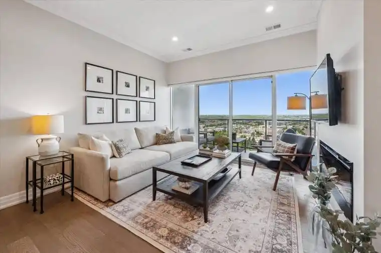 Welcome to 1010-1880 Gordon St, elegant 1-bdrm + den condo perched high above Guelph’s sought-after south end! From the moment you step inside, you’re greeted by expansive wall of windows framing panoramic views of lush treetops & the city skyline-an inspiring backdrop for everyday living. Meticulously designed W/upscale finishes, this modern suite exudes comfort & sophistication. Soaring ceilings & wide-plank engineered hardwood floors create an airy sun-drenched ambience that flows seamlessly through the open-concept living space. Relax by sleek B/I fireplace in living room or step onto private balcony-perfect retreat for morning coffee or unwind while taking in beautiful city views. Gourmet kitchen features crisp white cabinetry, gleaming quartz counters, classic subway tile backsplash & premium S/S appliances. Oversized breakfast bar accented by stylish pendant lighting, invites casual dining & entertaining. Retreat to spacious primary bdrm where floor-to-ceiling windows deliver the same breathtaking vistas & fill the room W/natural light. Luxurious 4pc bath W/oversized vanity, quartz counter & deep soaker tub surrounded by marble-inspired tile. Elegant French doors reveal versatile den-ideal as home office, guest room or creative studio. Thoughtful storage solutions include large W/I closet in entryway & large pantry off the dining area keeping everything organized & within reach. Residents enjoy impressive array of amenities: state-of-the-art fitness centre, golf simulator lounge W/bar, entertaining spaces W/full kitchen & billiards, guest suite & landscaped outdoor terrace. Underground parking for yr-round convenience . Steps to Pergola Commons where you have access to everyday essentials-groceries, cafes, restaurants & shops plus quick connections to 401 for commuting. Whether you’re picking up fresh produce, meeting friends for dinner or exploring nearby parks & trails, this vibrant neighbourhood has it all! Experience the elevated lifestyle you deserve!