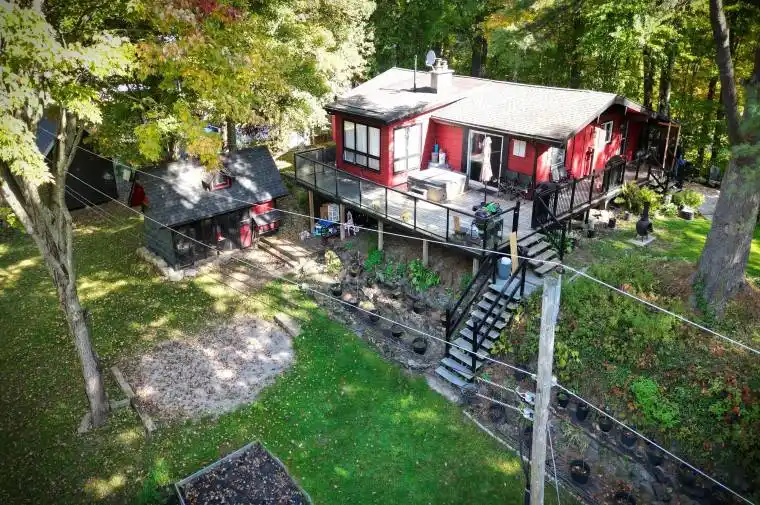 Reasons You Will Love This Home1. Prime Waterfront Lifestyle: Capture the essence of summer with a captivating view of the Trent-Severn Waterway and Lock 42 perfect for watching the boats go by. The lot backs onto protected Parks Canada waterfront. For a low annual fee ($53.50) enjoy use of this property including a private dock the owner has at the shoreline. Walking distance to Lock 42 restaurant and village of Washago. 2. Viceroy Bungalow: Perfection Enjoy the bright, airy feel of a Viceroy bungalow featuring a dramatic cathedral ceiling, oak hardwood flooring and an open-concept main floor. The main level is designed for convenience with a large entrance and main floor laundry. The walkout leads to an expansive wrap-around deck, seamlessly blending indoor and outdoor living. 3. Versatile Living SpaceThis home offers smart, flexible living with 1+2 bedrooms and 3 full bathrooms. The fully finished walkout basement expands your living options, providing two bedrooms, a full bathroom, and a spacious recreational room ideal for guests, family, or entertainment. 4. Unmatched Privacy & Parking: The backyard is a private, landscaped oasis. It’s easily accessed vehicle if needed via a private neighbour road for. Plus, you’ll never worry about storage or parking again with a 36 ft long x 20 ft. wide and 16 ft. tall detached garage , a second 12 ft. x 20 ft. garage, a 10 ft. x 20 ft. chicken coop and a 9 x 10 ft. shed plus a 10 ft. x 20 ft. outdoor dog pen