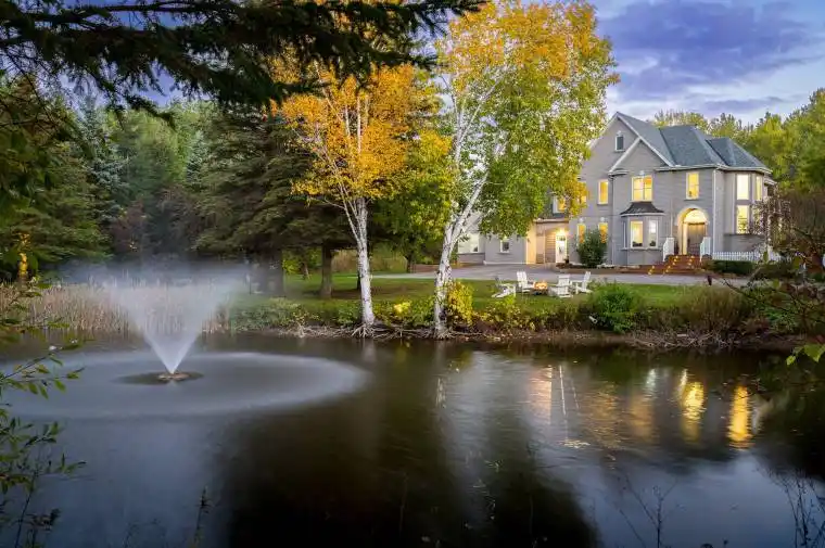 Welcome to an extraordinary 14.95-acre country estate that defines luxury living in the heart of Collingwood. Just minutes from downtown yet surrounded by the serenity of nature, this remarkable property offers a harmonious balance of elegance, privacy, and lifestyle – an idyllic retreat for those who value space and sophistication. A picturesque maple-lined driveway winds through the property, leading to a tranquil pond and fountain that set the tone for the residence beyond. The beautifully updated main home spans over 4,300 square feet, featuring 5 bedrooms and 6 bathrooms, thoughtfully reimagined with refined modern finishes. Three fireplaces, dual staircases, and ensuites in every bedroom speak to the home’s quality and craftsmanship, while multiple walkouts open seamlessly to expansive terraces, patios, and decks – perfect for entertaining or quiet moments immersed in nature. Every element has been carefully curated, from new windows and floors to the roof, driveway, and professional landscaping, ensuring a timeless and inviting atmosphere. Enhancing the estate’s appeal is the 2023-built guest residence, an approved Accessory Dwelling Unit (ADU) by Clearview Township. This 1,800-square-foot home features 2 bedrooms and 2 bathrooms, exuding the same level of luxury and style. Connected to a heated pool and generous deck, it offers endless possibilities – an elegant in-law suite, private guest quarters, or an income-generating retreat for seasonal visitors. The back 10 acres offer private trails that border scenic apple orchards and provide breathtaking views toward Osler Bluff. Mature maples and fruit trees frame the landscape, creating a true four-season sanctuary. Few properties offer such a rare combination of scale, privacy, and proximity to downtown Collingwood. This exceptional estate captures the essence of refined country living – where luxury, nature, and lifestyle meet in perfect harmony.