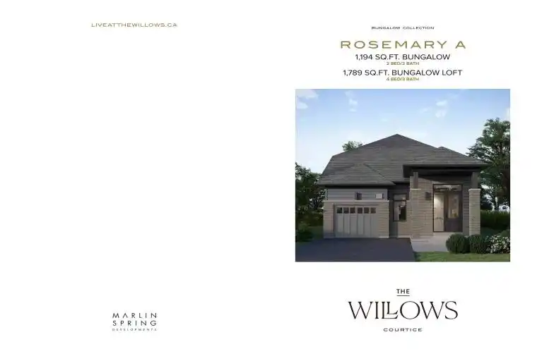 Welcome to The Willows, a charming new community in Courtice, featuring 220 homes surrounded by picturesque greenspace, developed by the award-winning Marlin Spring Developments. This brand-new 1,194 sq ft, 2-bedroom bungalow offers a spacious layout with 2 bedrooms, 2 bathrooms and impressive 9-foot ceilings on the main floor with optional Bungalow Loft Plan, 4 bed, 3 bath. This beautifully designed bungalow offers an open-concept kitchen, dining room, and great room, complete with a center island, creating an inviting space perfect for entertaining The primary bedroom boasts a luxurious 3-piece ensuite, which includes a separate seamless glass shower. The second bedroom has its own private bathroom. Courtice is renowned for its family-friendly atmosphere, offering parks, schools, and a variety of recreational facilities perfect for creating lifelong memories. The Builder is offering a 5-piece appliance package which includes a Stainless Steel Fridge, Stove and Dishwasher and Front-Loaded White Washer & Dryer. *Optional 4-bedroom plan is offered for this home* 9′ foot ceilings. Laminate flooring on main floor, Quarts Kitchen Counters and Centre Island Master Ensuite has seamless glass shower, stand alone soaker tub, double sinks. *Limited Time Only* Extended Deposit Structure* Only $2,500 per month