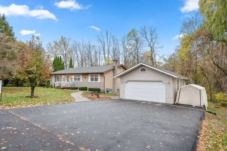 Welcome to this charming 3-bedroom bungalow set on a beautifully treed 0.64-acre lot in rural Brighton, just a short drive to local shopping, schools, and all the amenities of downtown. This well-maintained home offers a traditional floor plan featuring an oversized living room and an updated kitchen complete with a centre island, abundant cabinetry, and generous counterspace. The adjoining family room includes two walkouts-one to a south-facing garden area and another to an east-facing deck with a covered gazebo, perfect for outdoor entertaining. The primary bedroom includes a convenient 2-piece ensuite, while two additional bedrooms and a 4-piece main bath complete the main level. The lower level provides excellent additional living space with a large recreation room featuring a cozy woodstove, a separate office, a workshop area, and a walkout to the backyard. Additional property highlights include a detached two-car garage with workshop space, a double asphalt driveway, and two storage sheds for garden and equipment needs. This property offers the perfect blend of rural tranquility and easy access to town conveniences – ideal for families or those seeking peaceful country living.