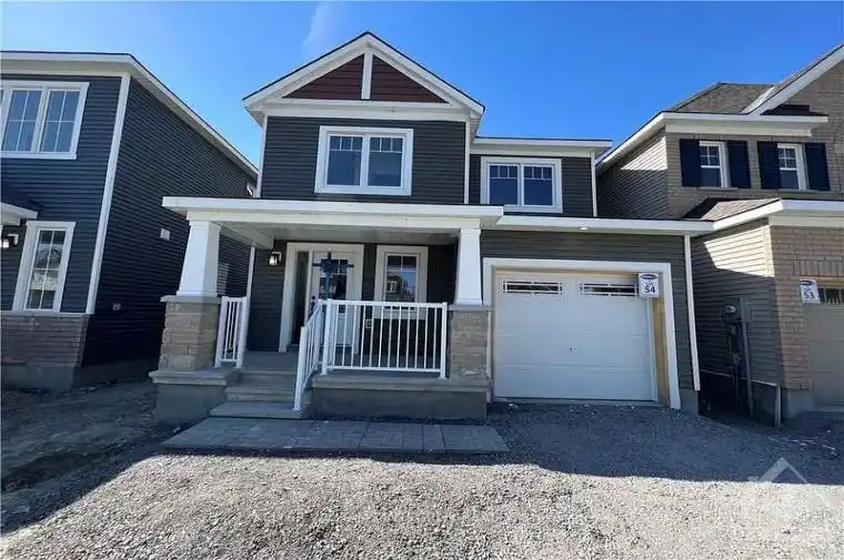 Welcome home! Live in this charming detached house located in the rapidly growing Stittsville community! This unique 3-bedroom, 2.5-bathroom home offers abundant natural light, premium finishes, and a large, beautiful front porch. Across the tiled foyer, the main level features an extra-large great room and an open-concept kitchen with a breakfast area. The kitchen is spacious and elegantly tiled, complete with stainless steel appliances appliances, a large island, upgraded tall cabinets, and a sleek sterling-grey tile backsplash. Hardwood flooring runs throughout the main floor, adding warmth and elegance.Upstairs, the primary bedroom impresses with a walk-in closet and a 3-piece ensuite. Two additional good-sized bedrooms and another 3-piece shared bathroom complete the second level.Conveniently located close to Highway 417, Tanger Outlets, CTC, Costco, and many other amenities. The photos were taken previously.