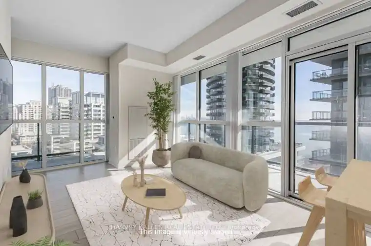 Welcome To Water’s Edge Condos At Toronto’s Prestigious Humber Bay Shores. Highly Sought After Layout And Beautifully Designed Corner Suite, Offering Stunning City Skyline And Lake Views. The Spacious Bedroom Features Direct Access To The Balcony, A Proper Entrance Door, And Semi-Ensuite Bathroom Access For Added Privacy And Convenience. The Modern Kitchen Is Equipped With Full-Sized Appliances, Undermount Lighting, And Offers Easy Access To The Large L-Shaped Balcony-Perfect For Entertaining Or Relaxing. High 9ft Ceilings And Expansive Floor-To-Ceiling Windows Flood The Suite With Natural Light, Enhancing The Bright And Airy Feel Throughout. The Building Amenities Include A Gym, Indoor Pool, Theatre Room, Guest Suites, Party Room, Outdoor Terrace With BBQ, And More – Creating The Perfect Lifestyle Experience For Residents. Included With The Suite Are One Parking Spot And One Locker, Ensuring Your Convenience And Storage Needs Are Covered.