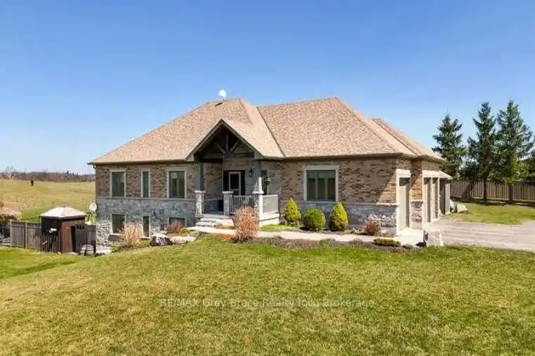 This magnificent custom built Bungalow with attached 3 car garage sits on over 2 acres. This impressive stone & brick home is showcasing exceptional attention to detail & quality finishes throughout. The home has 3230 sq. feet of finished space. The heart of the home is Bright & Spacious with open concept living room with fireplace, dining room & kitchen with lots of cabinetry, a large island & walk in pantry. The patio doors from the dining room lead out to the deck. The main floor has 3 large bedrooms. The primary bedroom features a walk in closet & the ensuite is a sanctuary of luxury with heated floors a walk in shower & soaker tub. The other 2 bedrooms could be used as a in law suite or teenager private space with 1 bedroom, full bath with heated floors and living room with fireplace. The basement boasts 9′ ceilings, in floor heat, 2 bedrooms, a 3 piece bath, laundry room, utility room, recreation room & Bright family room with walk out to your own private oasis with a heated inground pool, patio & hot tub for lounging and entertaining. Whether you’re hosting gatherings or enjoying peaceful moments this outdoor space will surely please. Despite the serene setting, this property is only 5 minutes away from essential conveniences. Your dream home awaits!