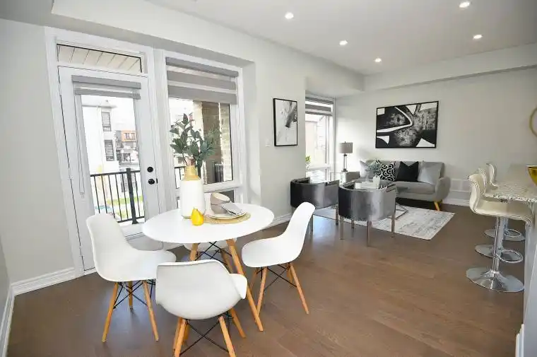 GORGEOUS 3-STOREY TOWNHOME LOCATED IN HIGHLY SOUGHT-AFTER SOUTH EAST AJAX, ONLY 1.5 YEARS NEW. FRESHLY PAINTED AND POT LIGHTS INSTALLED THROUGHOUT. THE GROUND FLOOR FEATURES A BRIGHT DEN WITH STAINED OAK FLOORING, OAK STAIRCASE, AND A 2-PC BATH. THE MAIN FLOOR OFFERS AN OPEN-CONCEPT LAYOUT WITH A MODERN GRANITE KITCHEN, UPGRADED WOOD CABINETRY, BREAKFAST BAR, AND HIGH CEILINGS. THE SPACIOUS LIVING AND DINING AREA BOASTS STAINED HARDWOOD FLOORING, AN ADDITIONAL 2-PC BATH, AND A WALK-OUT TO A BALCONY. LARGE WINDOWS THROUGHOUT PROVIDE ABUNDANT NATURAL LIGHT. THE THIRD FLOOR FEATURES HIGH CEILINGS, A LINEN CLOSET, AND A CONVENIENT LAUNDRY ROOM. TWO GENEROUSLY SIZED BEDROOMS INCLUDE A PRIMARY BEDROOM WITH A 4-PC ENSUITE, WALK-IN CLOSET, AND PRIVATE BALCONY. THE SECOND BEDROOM OFFERS A CLOSET, LARGE WINDOW, AND ACCESS TO A MODERN 3-PC BATH WITH GLASS SHOWER. BRIGHT, SPACIOUS, FRESHLY UPDATED, AND IMPECCABLY MAINTAINED A MUST-SEE!
