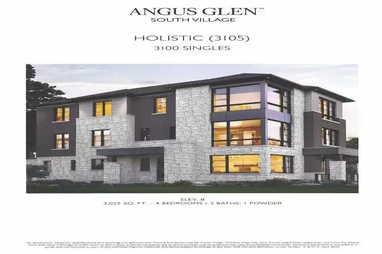 Modern Detached 4 Bed. 3.5 Bathroom BRAND NEW Home 3025 sq. ft. in Angus Glen South Village. Gorgeous neighborhood surrounded by protected green space, loads of trees and walking trail access. Hardwood floors, and stairs, throughout, porcelain tiles in kitchen & bathrooms. Superb high quality loft style windows, 9′ 10′ 9′ Smooth ceilings, 8′ doors, Open concept kitchen /breakfast family rooms. Gas fireplace. Primary bedroom has Volume ceiling & 5 piece ensuite with stand alone tub, glass shower. Cold cellar in basement. 20 pot lights + 4 outside. 2 car garage + 2 car driveway. Kitchen boasts built in 36″ ‘WOLF’ S/steel gas stove, 34″ hood fan, 36″ S/S ‘Sub Zero’ fridge, ‘Bosch’ dishwasher, ‘Wolf’ microwave. Quartz counters, Upper cupboards to ceiling with trim & light valance, ‘Yoga’ Studio/could be office with wet bar & 3 piece bathroom French door walk out to balcony. Cat 6 R/I network wiring, elec. for TV. Close to Angus Glen Golf Course, Community Centre, great grocery store & ‘Toogood Pond park. High ranking Pierre Elliot High School, New Elementary School coming 2027 within walking distance.