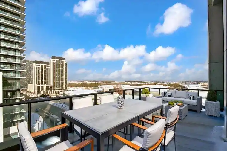 Welcome To Charisma 2 In The Heart Of Vaughan! This One-Of-A-Kind, Beautifully Designed Corner Suite Features Two Rare Outdoor Spaces: A Spacious 387 Sq. Ft. Terrace Plus An Additional 123 Sq. Ft. Balcony, Perfect For Seamless Indoor-Outdoor Living And Entertaining. You Will Love This Home For 8 Amazing Reasons: 1. A Bright, Open-Concept Layout With A Generous Living And Dining Area And Walk-Out To The Balcony. 2. A Modern Kitchen With Full-Size, Brand New Never-Used Stainless Steel Appliances, Quartz Countertops, And Breakfast Bar Seating. 3. A Spacious Primary Bedroom With Floor-To-Ceiling Windows, Walk-Out To Balcony And A Stylish 3-Piece Ensuite. 4. A Functional Separate Den Ideal For A Home Office Or Additional Sleeping Area. 5. A Convenient Powder Room, In-Suite Laundry, And A Thoughtfully Designed Foyer. 6. It’s Perfect For Investors, First-Time Buyers, Or Downsizers Seeking Comfort, Lifestyle, And Convenience. 7. The Unit Includes 1 Underground Parking Space, 1 Locker, And 1 Bicycle Storage Unit. 8. It Is Located In One Of Vaughan’s Most Desirable Master-Planned Communities-Steps To Vaughan Mills, Dining, World-Class Amenities, Transit, Parks, And Hwy 400. This Rare Offering Provides Exceptional Value With Premium Outdoor Living Rarely Found In Condo Residences!
