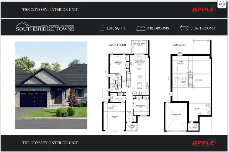 Quality Apple Homes Luxury Townhome Bungalow. Premium Freehold Living – No Condo Fees, Exceptional Craftsmanship. Discover the new Quality Apple Homes luxury townhome bungalow, thoughtfully designed for discerning homeowners seeking comfort, style, and lasting value. Built entirely freehold with no condo fees, these homes offer wider lots and larger garages, all complemented by flexible closing dates to suit your needs. Apple Home Builders brings 25 years of hands-on expertise to every project, ensuring your home is constructed with care and precision. Experienced craftsmen use upgraded materials, creating a residence that stands out for its durability and elegance. Each townhome is available in several sizes, with a tasteful mix of stone and brick covering the entire main floor façade.This popular Odyssey layout features: 2 spacious bedrooms and 2 baths. A generous garage with ample storage 1316 sq ft of refined living space. A large, open concept main floor for flexible entertaining and family gatherings, 9 ft ceilings throughout the main floor, plus a raised ceiling in the great room for added grandeur. Rear patio door to composite deck covered by roof. Enjoy a custom quality kitchen, highlighted by a large island and your choice of premium cabinets extending to the ceiling. The open staircase leads to the basement, adding architectural interest and effortless flow to the main floor design.The main floor laundry provides everyday convenience. The primary bedroom boasts a luxury ensuite, complete with an oversized tile and glass shower. With a reputation for building homes the way you want, Apple Home Builders guarantees a personalized experience from start to finish. Each luxury townhome bungalow combines thoughtful design, quality materials, and expert craftsmanship, creating a home you’ll cherish for years to come. Please note: Property Taxes are not yet assessed and will be established upon completion (
