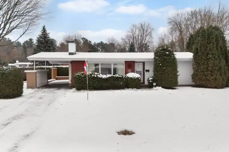 OPEN HOUSE Sunday, January 18, 2 to 4 pm – Welcome to 30 Ellery Crescent, a lovely 3 bedroom, 1.5 bathroom home located on a corner lot in the heart of Lynwood Village, Bells Corners. Lovingly maintained by the same owner for 56 years, this property sits on a quiet, child-friendly street. The L-shaped living and dining room features a brick-surround wood-burning fireplace and is enhanced by a large picture window that fills the space with natural light. The adjacent kitchen, updated in 2015 and featuring cork flooring, quartz countertops, ample cabinetry, and room for a breakfast table, provides both function and warmth (fridge replaced in 2021). Three well-proportioned bedrooms and a renovated four-piece bathroom with quartz counters and a linen closet complete the main level, where strip oak hardwood flooring flows throughout most of the space. The lower level offers exceptional versatility, including a spacious recreation room a legal egress window, a laundry area with bar top and sink, and a den that could easily serve as a fourth bedroom, complete with its own two-piece bath. Additional features include a storage room with built-in shelving and a utility room with tiled flooring and space for a workshop. Outdoors, the private back and side hedged yards with slate patio provides the perfect setting for relaxation or entertaining, while the carport offers extra storage convenience. Notable updates include roof (2018), furnace and A/C (2015, contract to be paid out by the seller before closing upon request), hot water tank (2015, rented), washer and dryer (approx. 2020), gutter covers (2013), windows, and central vacuum with attachments. Ideally situated just steps from the Entrance Pool, the NCC Greenbelt with miles of trails, and within walking distance to schools, churches, shops, restaurants, and all the amenities of Bells Corners, this home offers both comfort and convenience. Quick closing is available!