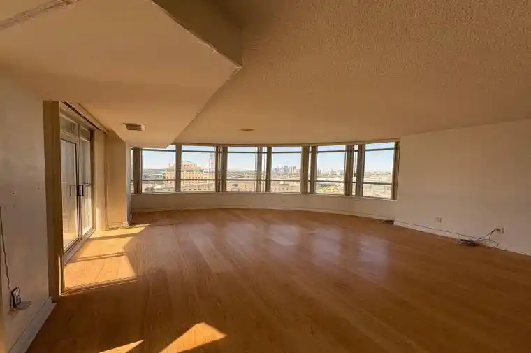 Spacious 2 Bdrm+Den, 2 bath unit in the heart of Mississauga. Great open concept layout, bathed in natural light. Curved rear bay window overlooking Celebration Square; watch live performances and fireworks from the unobstructed balcony view. 1 Parking space.