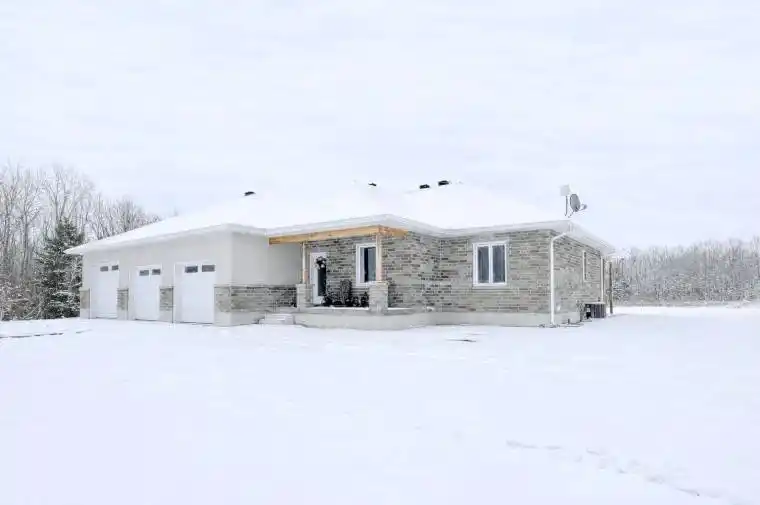 This 2024 custom-built 4-bedroom bungalow delivers approximately 1,670 sq. ft. of intelligently designed living space on a pristine 7.5-acre country setting that offers privacy, efficiency, and future expansion.. Constructed on a full ICF foundation with 9′ basement ceilings, the home is engineered for efficiency and longevity, complete with a Generac backup generator powerful enough to run two homes. From the moment you step inside, quality craftsmanship is evident. The open-concept main level features a striking kitchen with birch soft-close cabinetry, built-in double oven/microwave, oversized centre island, and dedicated coffee bar-perfectly flowing into a bright living room with a custom entertainment unit and access to a covered rear porch ideal for relaxing or entertaining. Car enthusiasts, hobbyists, and trades will appreciate the impressive 1,250 sq. ft. triple attached garage, featuring in-floor heating, arena-style lighting, and three dedicated breaker zones-designed to function as a serious workshop. Heating is efficiently supplied by an outdoor Heatmor wood furnace and/or propane system, providing domestic hot water and in-floor radiant heat to both the home and garage. Additional upgrades include an over-insulated attic, in-floor basement heating with separate garage access, pre-run conduits for future Fibe/internet, full home network wiring with multiple Wi-Fi boosters, gas BBQ hookups, and a security system with backup power. With approval potential for a secondary dwelling or shop, and well and septic systems designed for expansion, plus a second driveway already in place, this property offers exceptional flexibility for multi-generational living, income potential, or future growth. A rare opportunity to own a modern country home with superior utility systems, intelligent design, and room to grow. Please allow 24-hour irrevocable on all offers.