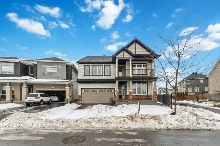 Unique 4 bedroom, 1 den, 2.5 bathroom detached home fronting an impeccable park in the prime Abbottsville Crossing neighbourhood of Stittsville! This beautifully designed home offering an impressive blend of style, comfort and functionality. The main floor showcases generous living spaces with high-quality engineered flooring, modern lighting and plenty of natural light. The layout includes a multi-purpose den, a formal dining room and a stunning open-concept area at the back of the home featuring the kitchen, eating area and a huge living room with a gas fireplace. The modern kitchen features massive counter space and island, upgraded cabinetry and exquisite stainless steel appliances. Upstairs, the spacious primary suite includes two walk-in closets and a bright 4-piece ensuite with separate soaker tub and standing shower. Three additional well-sized bedrooms, a charming reading nook, laundry room and a covered balcony with views of the park complete this level. Amazing Location – Close to great schools, transit, Trans Canada Trail, parks, shopping and much more!