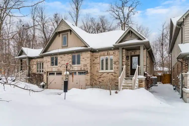 Over $75,000 in documented upgrades set this home apart. Welcome to 1046 Cook Drive in The Grove, a sought-after Craftsman-style neighbourhood in Midland’s desirable west end. Built in 2016 by award-winning Devonleigh Homes, this one-owner, meticulously maintained home sits on a premium lot backing onto a forested buffer zone for added privacy. This home includes over $50,000 in builder upgrades plus $26,000+ in additional improvements, making it truly move-in ready and well above typical comparables. Interior features include 9-foot ceilings, upgraded engineered hardwood flooring, Craftsman trim and oak staircase details, upgraded door hardware, and pot lighting in the living room and kitchen. The kitchen offers tall cabinetry with crown moulding, Cambria quartz countertops and island, extended breakfast bar, new zellige tile backsplash, stainless steel hood fan, and upgraded garden doors leading to a beautiful stamped concrete patio. The primary bedroom includes a walk-in closet and upgraded ensuite with air-jet tub and porcelain tile. Main-floor laundry features new cabinetry (2025) and Maytag front-load washer and dryer. The landscaped yard includes perennial gardens, privacy fencing, leaf-guard gutters, updated outdoor lighting, and a large stamped concrete patio overlooking the treed backdrop. Additional highlights include Frigidaire Professional stainless steel appliances with gas range, Lennox central air, insulated and drywalled garage with inside entry, water softener (2023), Kinetico K5 reverse osmosis system (2024), custom soundproofing on adjoining walls, and a high, dry unfinished basement with oversized windows, gas fireplace rough-in, and roughed-in 3-piece bath. This 2-bedroom, 2-bath home offers easy main-floor living with no condo fees, walking distance to shopping, hospital, restaurants, and theatre, and close to trails, parks, beaches, and Georgian Bay. Pride of ownership is evident throughout.