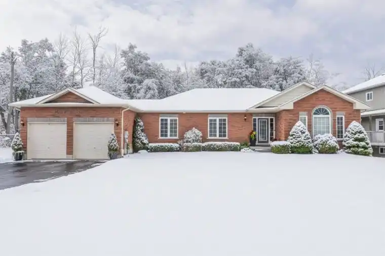 BEAUTIFUL ALL BRICK RANCH BUNGALOW STEPS FROM THE SHORES OF LAKE SIMCOE! Set on a private, treed corner lot backing onto forest, this A.N.T. built home offers a peaceful retreat with space, style, and endless potential. Boasting 1,859 SQFT the bright main level is highlighted by 9-foot ceilings, elegant crown moulding, and pot lighting throughout. The open-concept living area has a custom built fireplace and is ideal for both everyday comfort and entertaining, while 3 generously sized bedrooms provide exceptional flexibility. Two primary bedrooms feature ensuite access, creating ideal accommodations for guests or multi-generational living.The heart of the home is the large eat-in kitchen, complete with granite countertops, tiled backsplash, and a sliding glass door walkout to an expansive deck-perfect for summer dining overlooking the private backyard. The extensive basement boasts oversized windows and tall ceilings, presenting a blank canvas for additional living space, recreation, or a future in-law suite. Outside, mature trees surround the property, offering a serene, cottage-like setting while backing onto green space. A landscaped yard with a 24′ round above-ground heated pool on the expansive multi level deck has a gazebo and thoughtfully placed lighting to set the stage for evening gatherings. The yard is equipped with a workshop/shed with both a man door and a custom garage door for storage. Enjoy walking or biking with the public trail at the end of the road or enjoy the vibrant Friday Harbour Resort just minutes away. Other Notable Features: Roof (2024 and newer), A/C (2024), Hot Water Tank (2012), Smart Thermostat, Solar panels for pool heater mounted on roof, 200 amp electrical panel. This home is a rare opportunity to enjoy space, privacy, and the outdoors with a close proximity to the lake!