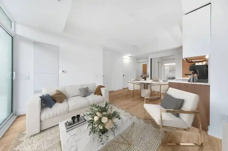 Experience modern boutique living at The Poet, a sought-after 6-storey residence in the heart of Leslieville. This virtually staged, upgraded 2-bedroom, 2-bathroom suite features a highly functional split-bedroom layout, offering exceptional privacy and everyday comfort. The bright open-concept living and dining area is framed by floor-to-ceiling windows and flows seamlessly to a large private balcony, ideal for relaxing or entertaining with city views. The chef-inspired kitchen is equipped with premium built-in appliances, a paneled fridge and dishwasher, and sleek contemporary cabinetry. The spacious primary bedroom includes a spa-inspired ensuite, ample closet space, and direct balcony access. The second bedroom is perfect for guests, a home office, or family use. Additional highlights include engineered European oak flooring, upgraded shower finishes, a welcoming foyer with built-in storage, in-suite laundry, and same-floor locker access. Parking and locker included. Residents enjoy premium amenities including a fitness centre, party/meeting room, pet spa, bike storage, visitor parking, and a stunning rooftop garden terrace with gas BBQs and sweeping city skyline views. Ideally located steps to Queen Street East, transit, parks, shops, cafés, and restaurants, with The Beach minutes away. A refined urban home offering lifestyle, convenience, and long-term value.