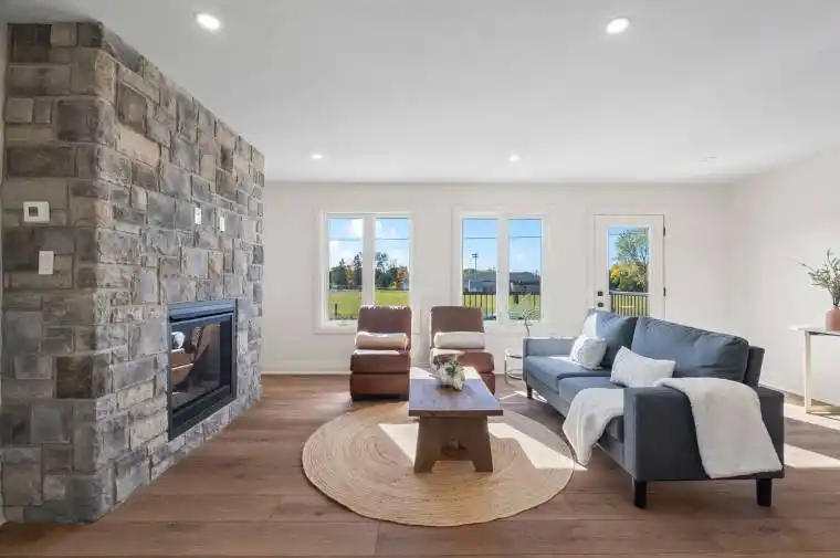 Located on a quiet cul-de-sac in Mount Forest, this Marlanna Homes semi-detached new build offers a lot more privacy than your typical semi! Attached to the other unit by just the garage, finished in clean Trusscore, there is access to both the house and the backyard. One of the best perks of this spot is the view from the back deck; you can catch local ball games and great sunsets right from your own yard. Inside, the main floor is wide open and bright, centered around a striking stone fireplace that gives the living room a solid, cozy feel. The kitchen is a standout, custom-built by Barzotti with quartz countertops, an island for extra seating, and all the appliances already included! The flooring is consistent with luxury vinyl plank throughout, so the space flows perfectly. Upstairs is practical for a family, featuring three Bedrooms and a dedicated Laundry room so you aren’t hauling baskets to the Basement. The primary suite is a great retreat with a walk-in closet and a deep soaker tub. If you need more space, the basement is already fully finished, which is perfect for a gym or a Recreation Room and includes another full Bathroom. This place is truly move-in ready with immediate possession available. Plus, you get total peace of mind with the Tarion warranty and a 50-year shingle warranty. It’s time to enjoy modern, quiet living without the “new build” wait time!