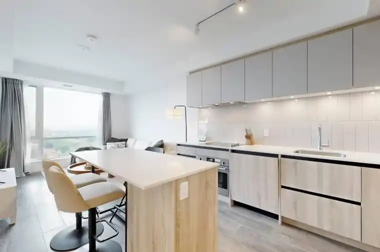 Surrounded by the quaint comforts of South Thornhill, this property combines stylish design, functional living, and access to an outstanding community. Residents will enjoy everyday conveniences with shops, cafés, restaurants, schools, lush parks, local transit, commuter highway networks such as Highway 407 and Highway 7, and The Promenade Mall all just moments away. Inside, the suite offers a bright and functional 1-bedroom plus den layout. The open-concept kitchen is finished with quartz countertops, premium appliances, ceramic tile backsplash, soft-close cabinetry, and a central island with dining space. The kitchen flows into the living area, where floor-to-ceiling east-facing windows bring in natural light and provide a walk-out to the private balcony. The primary bedroom features a large window wall and a walk-in closet with built-in organizers and lighting. The 4-piece bathroom is beautifully appointed with porcelain tile flooring, an integrated vanity sink with storage, frameless mirror with sconce lighting, and a deep soaker tub with full tile surround. A semi-open den offers flexibility as a home office or reading nook, while in-suite laundry with stacked washer and dryer ensures day-to-day convenience. Residents of this community have access to an exceptional collection of amenities including a fitness centre with yoga studio, multi-sport gymnasium with basketball court, co-working and meeting rooms, family and party spaces, and a seventh-floor terrace with BBQs, lounge areas, and a play zone for children. Outdoor living is enhanced by a landscaped community courtyard, fully fenced dog run, pet wash station, and 24/7 concierge. This property also includes one owned parking space and one locker for added convenience.