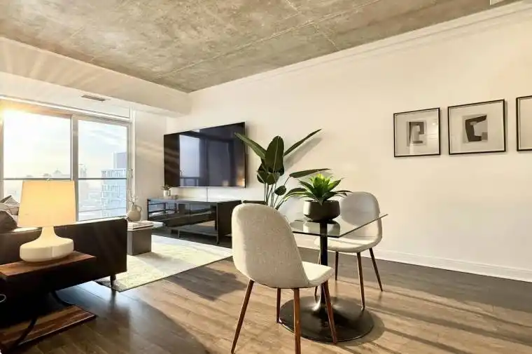 Live on The Esplanade in this bright, high floor, corner 1 bedroom suite offering 615 sq ft of well designed space with beautiful east views of the city and lake. Featuring 9 ft smooth exposed concrete ceilings that add height and character, giving the space a subtle loft inspired feel, along with dark espresso hardwood flooring throughout the living and dining areas. The functional kitchen is equipped with stainless steel appliances, granite countertops, an undermount sink, and a center island that doubles as a breakfast bar. The spacious bedroom is filled with natural light and offers a large closet with California Closet organizers. Marble bathroom, in suite laundry, and thoughtful storage including a custom coat California Closet organizer add to the comfort of the space. All appliances were recently purchased in 2025. This suite is being offered fully furnished with two large LG TVs (75″ & 85″), couch, motorized king bed, and an entertainment unit included. Just bring your pillow and sheets. Option to assume a premium rental parking spot located directly by the garage door and close to the elevators for $200 per month, prepaid until June, giving you time to decide if you need it. Located in the iconic London on the Esplanade, tucked between Front Street and the waterfront, steps to the Financial District, St. Lawrence Market, Union Station, The PATH, Sugar Beach, Metro, LCBO, restaurants, shopping, and transit. Walk Score 100. Building amenities include 24 hour concierge, rooftop outdoor pool, full fitness center and spa, party room, theatre room, library, and guest suites.