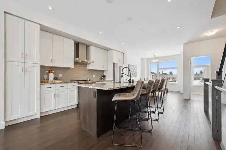 Upscale 2286sqft, 3-storey townhome located in award-winning complex in Guelph’s highly sought-after south end! Backing onto greenspace this home boasts one of the best positions in the community offering unobstructed views from the front & rear of the unit. With 3 bdrms, 3bathrooms & potential for add’l bdrms this home delivers privacy, functionality & lifestyle. Enter main level to bonus room filled W/natural light from large windows & pot lighting. This space easily adapts to your lifestyle & works well as home office, secondary living room, playroom or teen retreat. Follow the chic wood & glass staircase to heart of the home where open-concept main living area truly impresses. Kitchen is designed for everyday living & entertaining W/white cabinetry that extends to the ceiling, S/S appliances, backsplash & contrasting island topped W/stone counters & bar seating. Kitchen flows seamlessly into dining area where large window creates perfect backdrop for family meals. Livingroom offers rich hardwood, oversized windows & sliding glass door that opens to balcony overlooking treetops. This space is ideal for morning coffee or evening unwinding offering fresh air, privacy & calming connection to nature. 2pc bath completes this level. Upstairs primary bdrm offers W/I closet, large windows & private balcony. Ensuite W/dbl vanity, stone counters & glass-enclosed shower. 2 add’l bdrms & 4pc main bath W/granite counter & shower/tub. Convenient upper-level laundry! W/O bsmt offers endless possibilities to create 4th bdrm, rec room or office. Sliding doors lead to private patio extending the space outdoors. Each level of the home enjoys stunning backdrops of mature trees & protected greenspace. Easy access to 401, UofG bus route, GO Transit stops, trails & highly rated schools. You’re surrounded by dining options, groceries, fitness, banks & more. Stone Rd Mall & amenities are a short drive away making this an exceptional location for families, professionals & commuters!