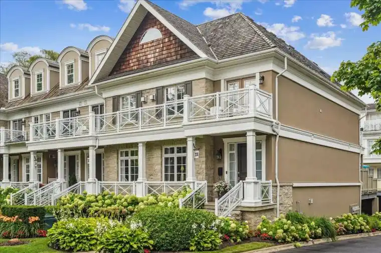 Wake up in the heart of Bronte Village, where coastal charm meets effortless living. This beautifully designed end-unit executive townhome offers a rare opportunity to enjoy a refined yet relaxed lifestyle just steps from the lake, shops, and some of Oakville’s most loved dining spots.Inspired by classic Cape Cod architecture, the home welcomes you with an open-concept main floor featuring gleaming hardwood floors, elegant crown moulding, and a cozy gas fireplace-perfect for both quiet evenings and lively gatherings. The chef-inspired kitchen is the heart of the home, complete with high-end appliances, granite countertops, a generous centre island, and plenty of space to entertain.Enjoy your morning coffee on the charming front porch overlooking manicured gardens with landscape lighting and an in-ground sprinkler system, or unwind in the evening on the expansive back deck. Designed for effortless outdoor living, this private space offers room for lounging, dining, and summer BBQs-an ideal, low-maintenance oasis for hosting friends or enjoying quiet moments at home.Upstairs, two spacious bedrooms offer peaceful retreats, each with its own private balcony and soaring vaulted ceilings. An upper-level laundry room adds everyday convenience.The fully finished basement provides flexible living space, perfect for movie nights, a family room, or a guest suite, complete with a three-piece bathroom and direct access to the garage. With parking for four vehicles, there’s plenty of room for both residents and visitors.Maintenance-free living means more time to enjoy what matters most, with snow removal, garden care, repairs, and private garbage collection all included. Just outside your door, Bronte Village comes alive with boutique shopping, cafés, grocery stores, waterfront trails, and the stunning shores of Lake Ontario.This isn’t just a place to live – it’s a way of life.