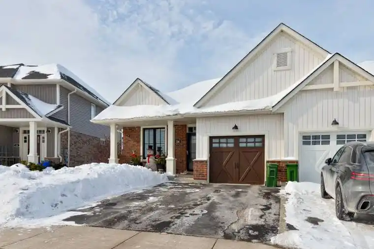 This end-unit bungalow townhouse sits on a premium pie-shaped lot and offer 4 parking spaces! Many great features including the open concept main floor with 9 ft. ceilings, a living room with a soaring vaulted ceiling with an electric fireplace, a modern kitchen with quartz countertops, a nice size island with breakfast bar, and a pantry, vinyl plank floors on the main floor and basement. 2+2 bedrooms and 3 full bathrooms (front bedroom is currently being used as a dining room). Master bedroom offering a 3 piece ensuite and a walk-in closet. Lots of additional living space in the basement with the family room, 2 bedrooms, and a full bathroom. Outside you’ll enjoy the covered front porch, deck with gazebo, and beautiful landscaping.