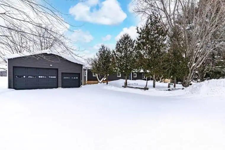 BUNGALOW WITH AN INSULATED DETACHED SHOP, UPDATED INTERIOR, & A PRIVATE 150 X 100 FT LOT! Drive down the country road and the first thing you notice is the striking 30 x 30 ft shop, followed by a charming bungalow, both finished in a sharp black exterior and framed by mature trees that give the property a true sense of privacy. Set on a treed lot with beautiful views and no immediate side neighbours, the setting feels intentionally set apart from the moment you arrive. A wide driveway offers loads of parking for vehicles, trailers, and guests, and the detached shop adds serious capability with hydro, 12+ foot ceilings, 100-amp service, and room for 4 more cars. The main living space feels open and connected, with a kitchen that’s easy to gather around, featuring grey shaker cabinetry, stainless steel appliances, a breakfast bar, and wood countertops. No carpet underfoot, just a clean, low-maintenance feel throughout the home, including two cozy main-floor bedrooms served by a 4-piece bathroom. A large mudroom keeps boots, coats, and seasonal gear in check, and the updated main-floor laundry adds open shelving storage with a stacked washer and dryer. Downstairs, the finished basement offers a separate entrance and added flexibility, with a spacious third bedroom, a rec room warmed by a propane fireplace, a nearby powder room, and updated flooring and ceilings. Out back, a large deck invites long afternoons and late nights, the hot tub is included for year-round downtime, and a shed keeps the extras tucked away. When you feel like getting out, Victoria Harbour amenities are just minutes away, and Midland is only 10 minutes from home for groceries, dining, and healthcare, with Georgian Bay marinas, boat launches, waterfront parks, and trail systems close enough for spontaneous plans.