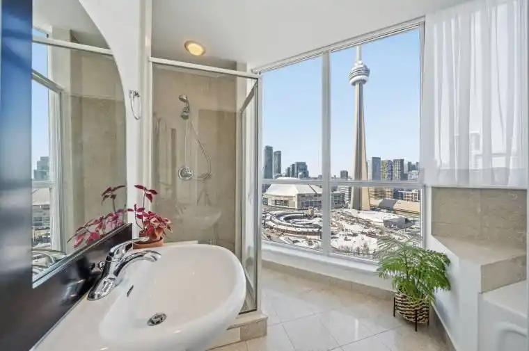 Stylish Waterfront Living with Panoramic Lake & Iconic City Views. Perched on a high floor, this executive residence offers uninterrupted lake vistas, front-row views of planes arriving at Billy Bishop Airport, and the CN Tower illuminating the skyline at night.Spanning approximately 1,200 sq. ft., this rarely offered suite delivers the scale of a home with the convenience of condo living. 9-ft ceilings, rich mahogany hardwood floors, and expansive windows flood the interior with natural light while framing spectacular water and city scenery.The designer kitchen showcases premium countertops, a matching stone backsplash, and Frigidaire stainless steel appliances; ideal for refined everyday living and effortless entertaining.The spacious primary retreat features a walk-in closet and a spa-inspired ensuite complete with a deep soaker tub overlooking the skyline and a separate glass shower. Additional enhancements include California closets and custom blackout blinds.An upper-level terrace provides a peaceful outdoor escape with serene lake views; perfect for morning coffee or evening unwinding. A premium parking space located just steps from the elevator ensures effortless daily access, while a generous locker offers exceptional additional storage.Exceptional walkability places Farm Boy across the street, Starbucks downstairs, and the Financial District, waterfront trails, dining, and entertainment just moments away.A distinguished offering that blends scale, elegance, and an irreplaceable waterfront setting.