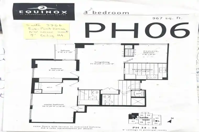 SUB-PENTHOUSE immaculate, BRIGHT & SPACIOUS with SUNSET VIEWS. This CORNER UNIT is a RARE oversized 2 Bedroom (originally 3 bedroom) with 9 foot ceilings, OPEN CONCEPT, LARGE PRINCIPAL ROOMS, LARGE CLOSETS, FLOOR EFFICIENT AREA of 967 SQ. FT. (feels much larger without hallways) to accommodate FULL SIZED FURNITURE! Fabulous UNOBSTRUCTED VIEWS! GREAT FENG SHUI! Walkout to a useable Balcony from Living Room. Dining room can be converted back to original builder’s 3 Bedroom floor plan. It’s great that the MAINTENANCE FEES COVERS 100% HYDRO COSTS, and all repairs, maintenance and replacement of the HVAC/Piping Systems (common element). In other condo buildings, the owners are 100% responsible for their own HVAC systems. Extra building amenities includes 2 guest rooms, & ample FREE Visitor’s P1 parking. PRIME AAA CONVENIENT LOCATION with direct access to Scarborough Town Center, Scarborough Civic Center, Scarborough U of T bus stop, Park, Subway, MegaBus, GO Bus & minutes to Hwy#401. Ideal for anyone seeking convenient lifestyle & vibrant community living! *** A RARE FIND!*** This 967 SQ.FT. CONDO OFFERED IS AN AFFORDABLE & AMAZING DEAL! For reference 60 BRIAN HARRISON WAY PH3403 of 910 sq. ft., 2 bedroom unit Sold for $665,000 in Oct.