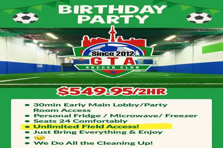 GTA Soccer Club and Events Facility for sale. Indoor Soccer Business utilizing 7,410 square feet. Established in 2012 and running successfully for over 14 years now. Solidly established steady clients! // 120×40 Indoor Soccer Training Turf Space, that rents for $185 plus GST per hour with additional venue and party space that can generate additional hourly rentals! OPEN 7 days a week! Very Easy To Operate. Needs only ONE Employee that Opens, Maintains & Closes the business. // The Premises boasts High End Established Clubs Contracts & Private Day Time Clientele. Prime Time Evenings Hourly Bookings Open Late. Popular for Birthday Parties & Private Events. 1 man easy turnkey operation. Open 7 Days a Week. 2nd Floor is a Fitness Club subleased for $2,700 monthly additional income. // Winter is the Predominant Busy Business Schedule. Potential for Day Care / Camps & other additional business activities! Professional Business Valuation Report including future projected income growth prepared by Palm Financial Solutions Inc. available upon request to qualified buyer.